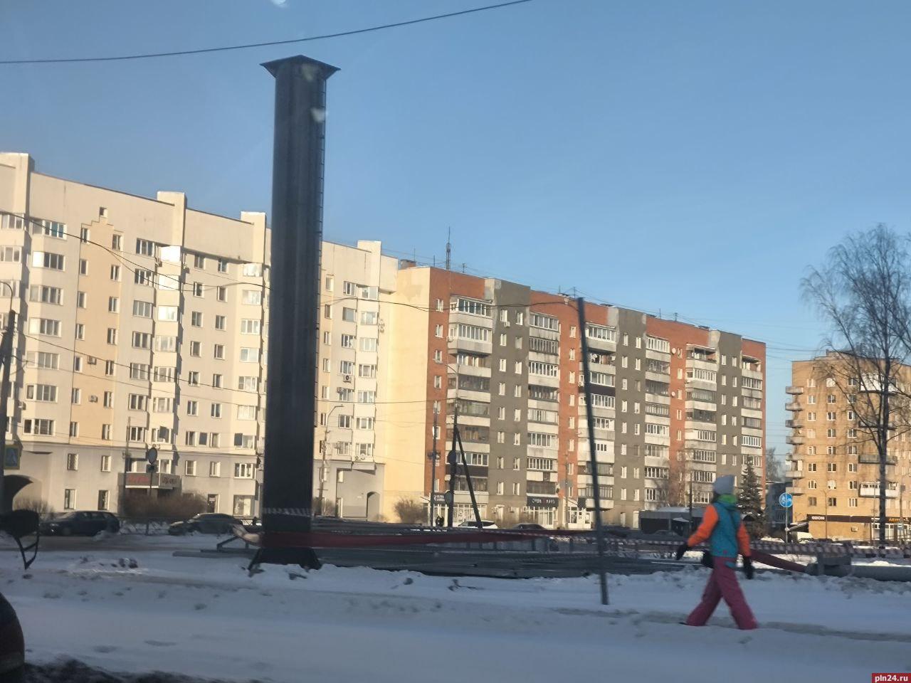 Рекламную конструкцию монтируют на перекрестке Рижского проспекта и улицы Юбилейной в Пскове.