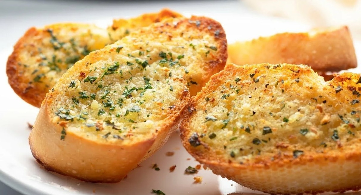 Потребуется багет, сливочное масло, чеснок, сыр и зелень. Масло размягчить, добавить чеснок и зелень, натереть сыр. Каждый ломтик багета смазать масляной смесью с двух сторон, выложить на противень и запечь до золотистой корочки. Гренки готовы за короткое время и создают ощущение полноценного блюда даже в спешке.