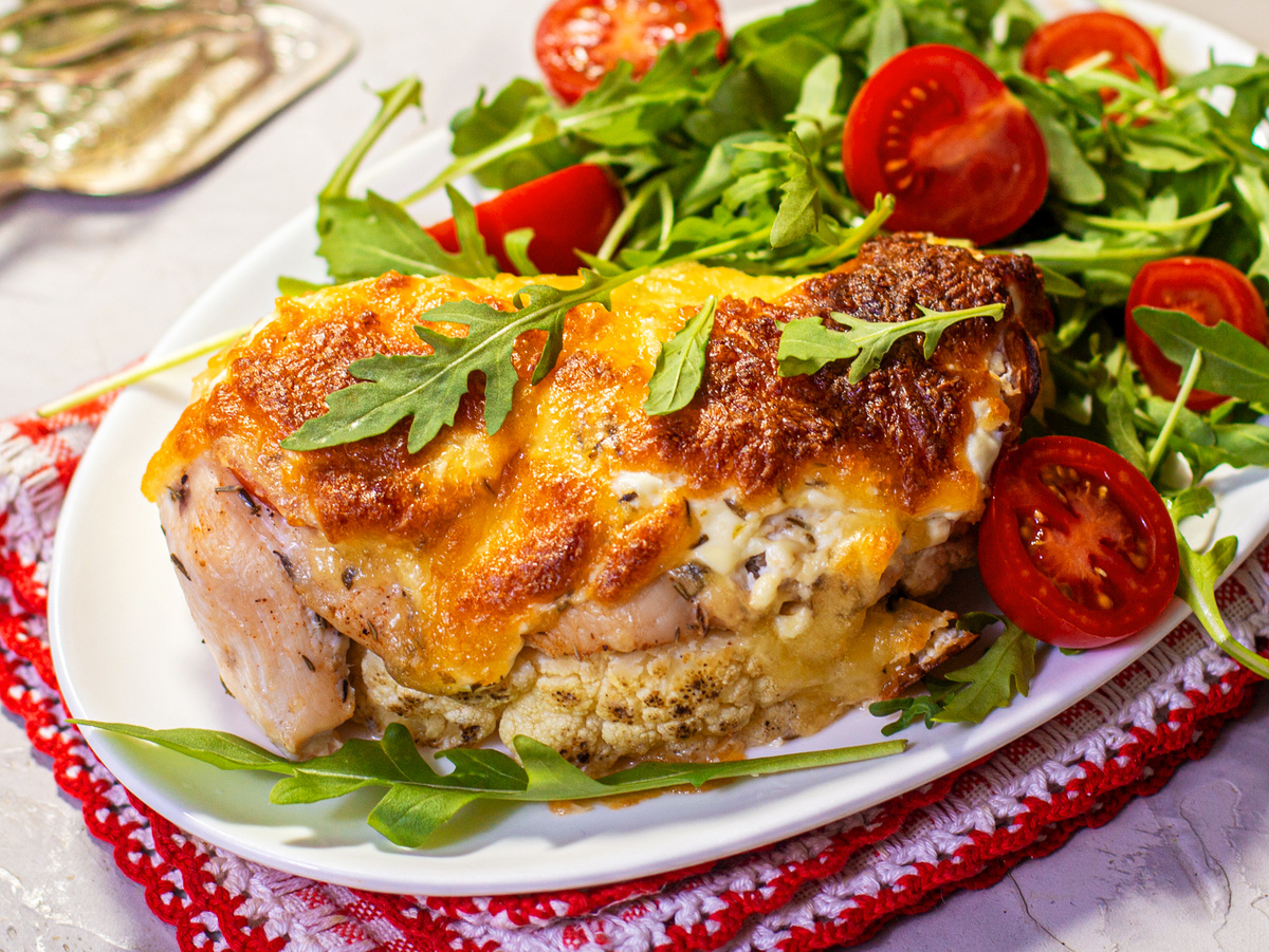 Сверху всё засыпается щедрой сырной корочкой из моцареллы, создавая аппетитную верхнюю пленку. Запекается до золотистой корочки при умеренной температуре, чтобы и капуста, и курица остались сочными.
