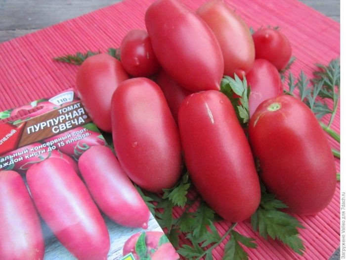 Пурпурная свеча относится к индетерминантным томатам: куст вырастает высоким и требует опор и грамотной подвязки. Плотный стебель и обильная листва создают условия для хорошей вентиляции, что особенно важно в сезон дождей и жаркой погоды. Плоды массой около 60–110 г образуют тесные кисти, и их цилиндрическая форма делает их удобными для укладки в банки и для нарезки в салаты.