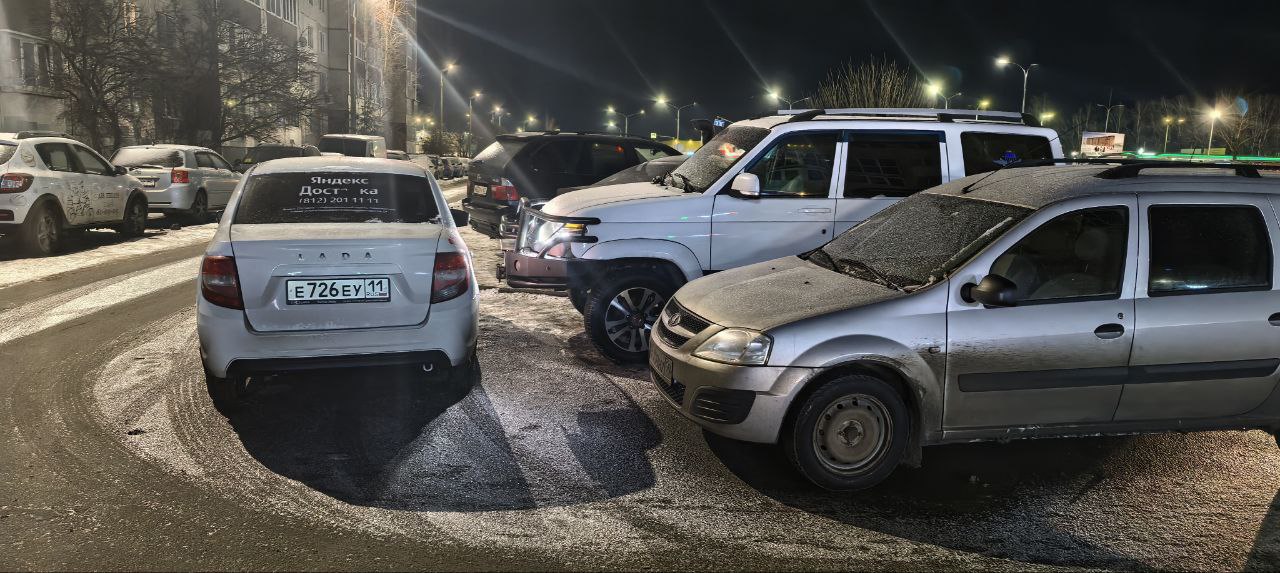 Какой-то умник, видимо, решил, что может парковаться, как ему угодно. Нет, это не доставка подъехала, сейчас отъедет. Классическая парковка на ночь. Ничего не шевельнулось в голове обладателя Гранты просто взял и заблокировал выезд нескольким авто.