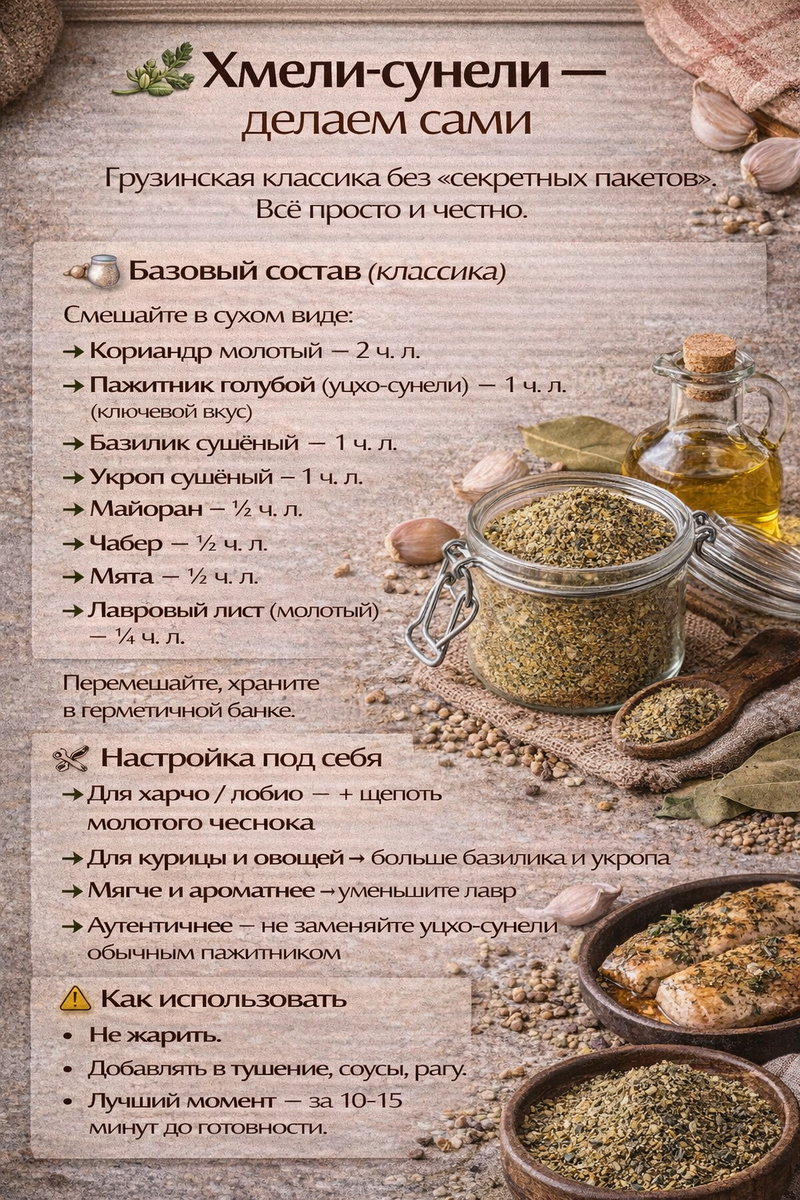 Простая и честная рецептура хмели?сунели — для тех, кто устал от загадочных «пакетиков» и хочет собрать аутентичную смесь самостоятельно. Это не острая приправа, а композиция ароматов, которая раскрывается в медленных блюдах.