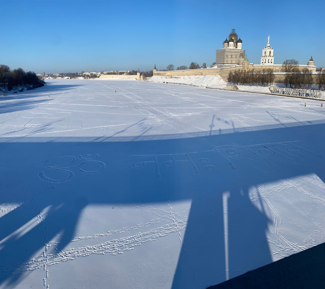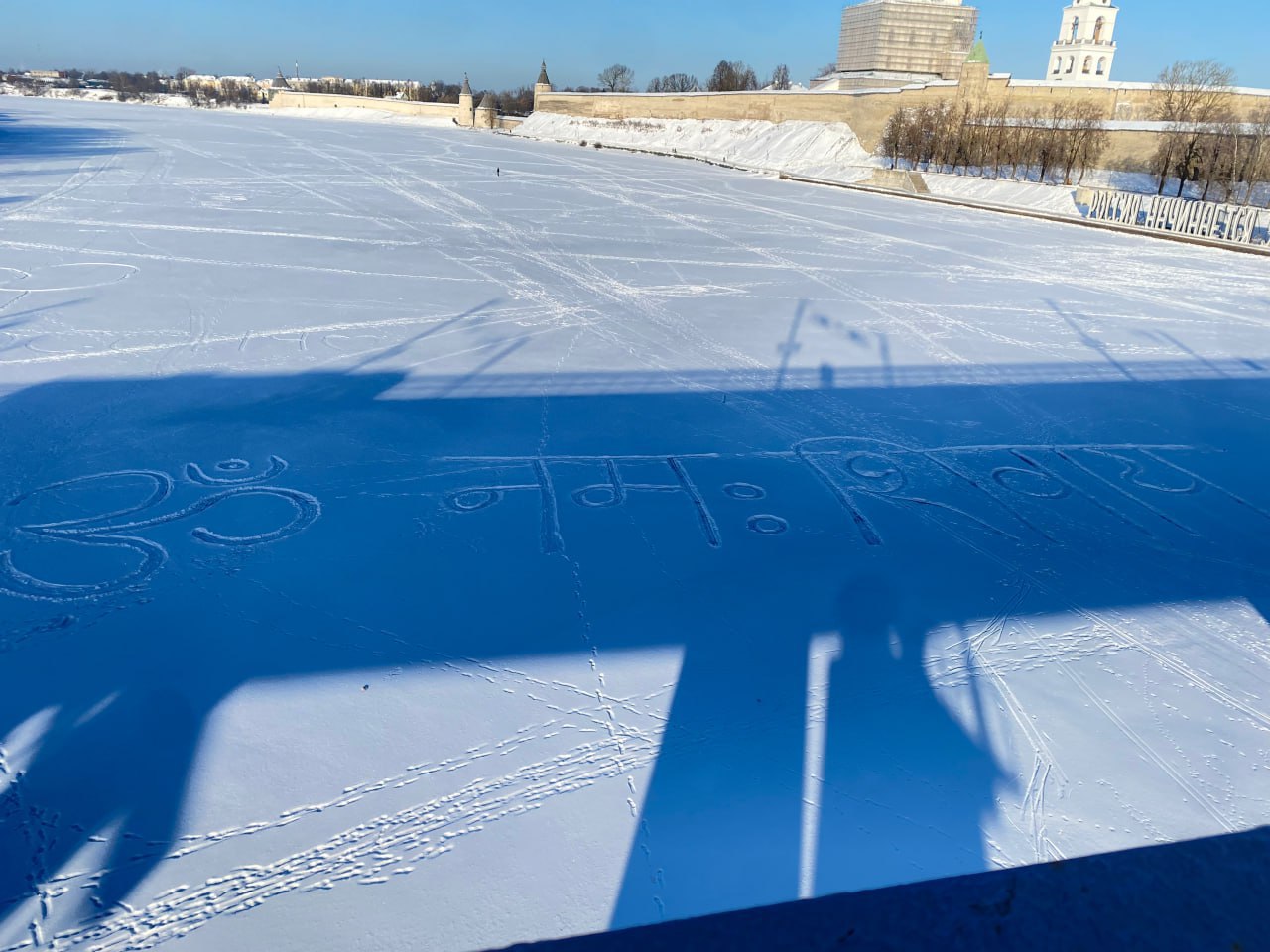 На снегу замерзшей р.Великой в Пскове появились сакральные письмена
