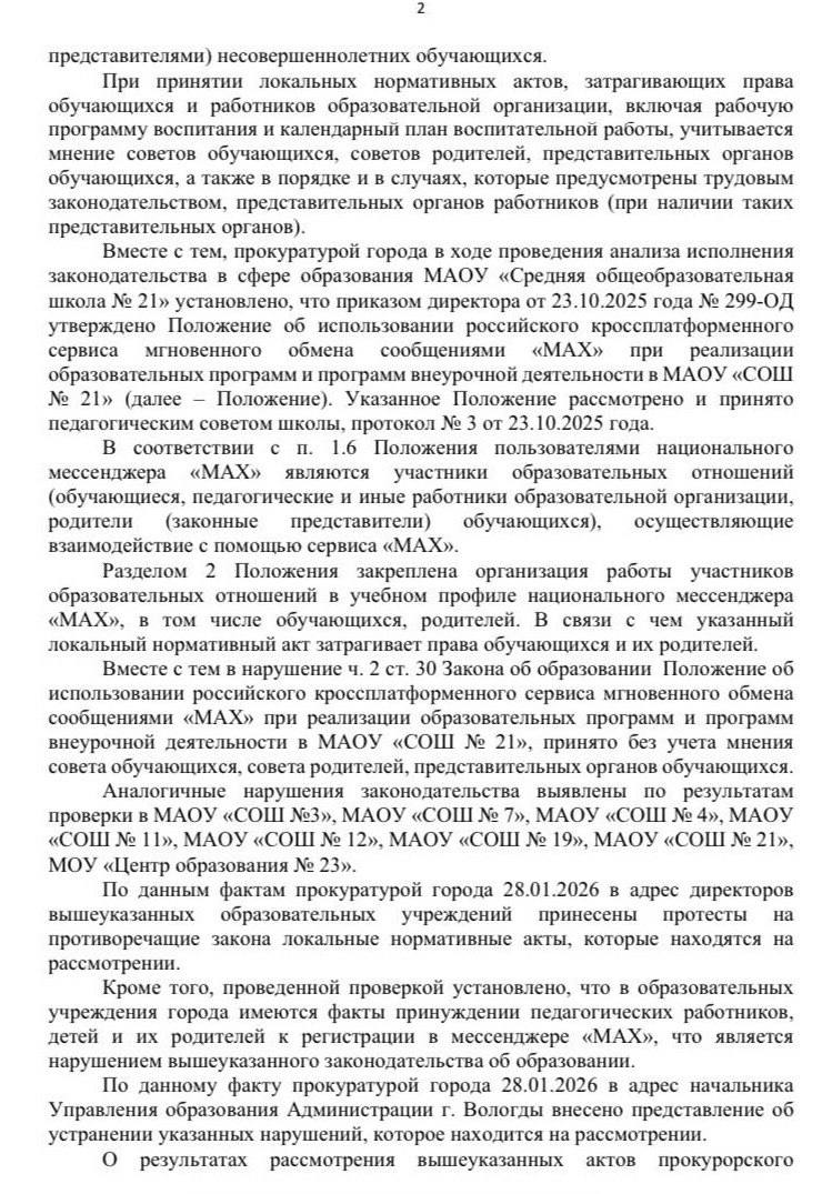Ранее несколько школ Вологды приняли положения об обязательном переходе на госмессенджер МАХ. Прокуратура, реагируя на обращения родителей, посчитала эти решения незаконными, поскольку правила пользования мессенджером были установлены без учёта мнения учеников и родителей. Кроме того, были выявлены факты принуждения к регистрации в приложении.