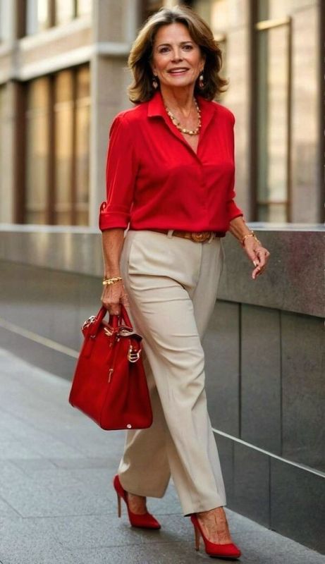 2. Красный тотал лук: Полностью красный наряд – это выбор уверенной в себе женщины. Комбинация прямых брюк с высокой посадкой, тонкого джемпера с высоким горлом и классического пальто демонстрирует элегантность и изысканность женщин старше 50. Убедитесь, что фасоны выгодно выделяют фигуру.