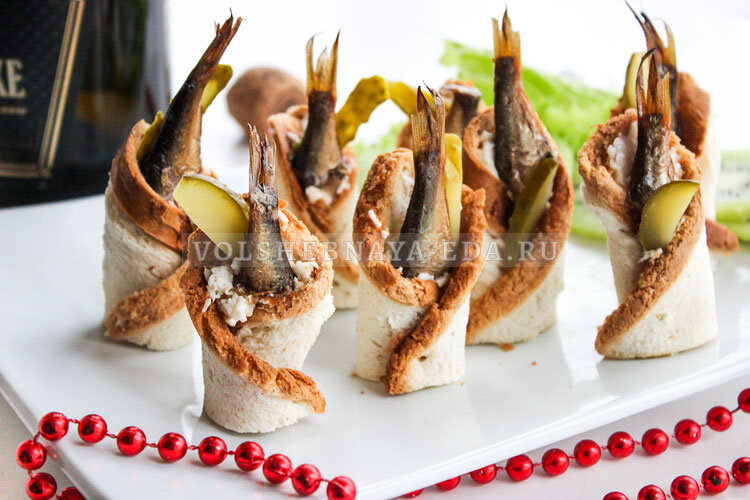 Совет! Лучше всего подойдут мелкие шпроты, которые элегантно разместятся в «конвертиках».