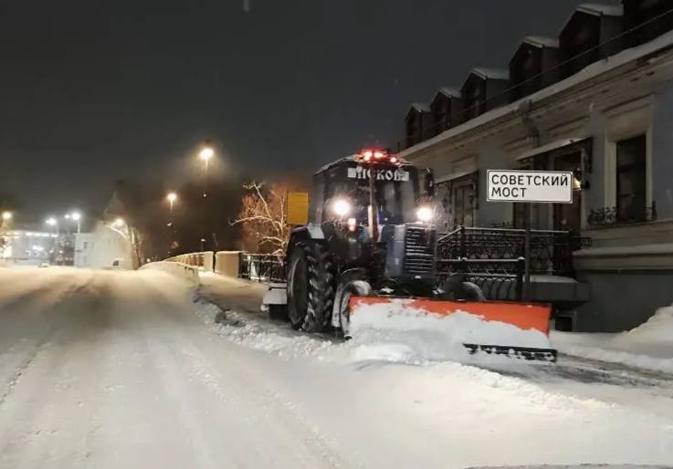 В Пскове с ночи идет уборка снега после обильного снегопада