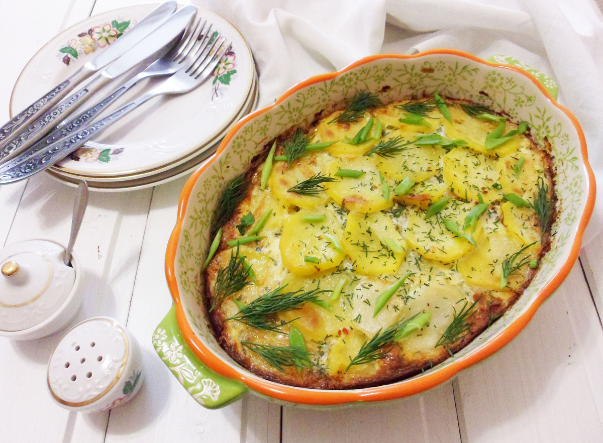 После слоя рыбы снова идет картофель и укроп, причём завершающим должен быть именно картофель. Затем в отдельной миске смешиваются сливки с яйцами, а также добавляются соль и черный перец. Эту смесь нужно аккуратно залить в форму с запеканкой.