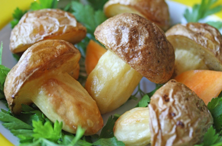 Отправьте противень в предварительно разогретую до 200 градусов духовку и запекайте в течение 50 минут. В результате получаются аппетитные картофельные грибочки, которые можно подавать как гарнир к мясным блюдам. Они не только вкусные, но и удивительно красивые!