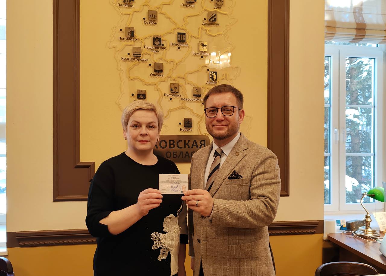 Председатель комиссии Игорь Сопов вручил зарегистрированному депутату Псковского областного Собрания депутатов седьмого созыва Наталье Тудаковой удостоверение об избрании
