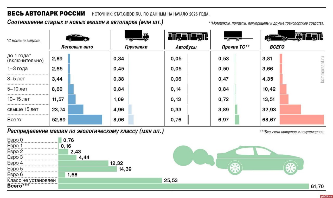 По данным Госавтоинспекции на 1 января 2026 года, в России зарегистрировано 68 млн транспортных средств. Из них 67,7% — автомобили старше 10 лет, что резко контрастирует с показателем годом ранее (42,3%).