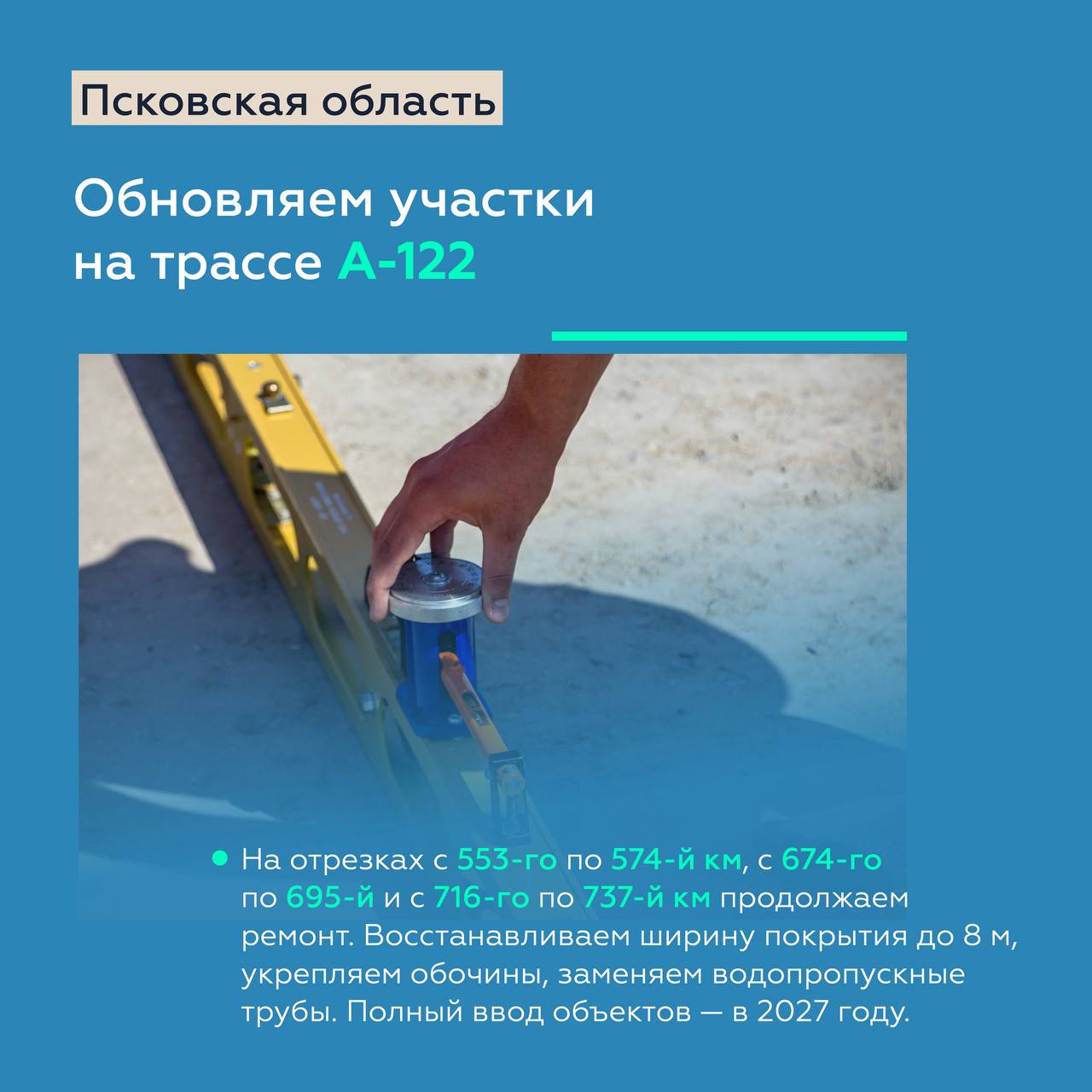 Так, на А-122 автодорога А-114 – Устюжна – Крестцы – Яжелбицы – Великие Луки – Невель продолжаем ремонтировать несколько участков общей протяжённостью более 80 км. Также на этой трассе капитально ремонтируем два моста через реки Смердель и Насвинка. Вместо старых сооружений построим новые, рассчитанные на современные нагрузки.