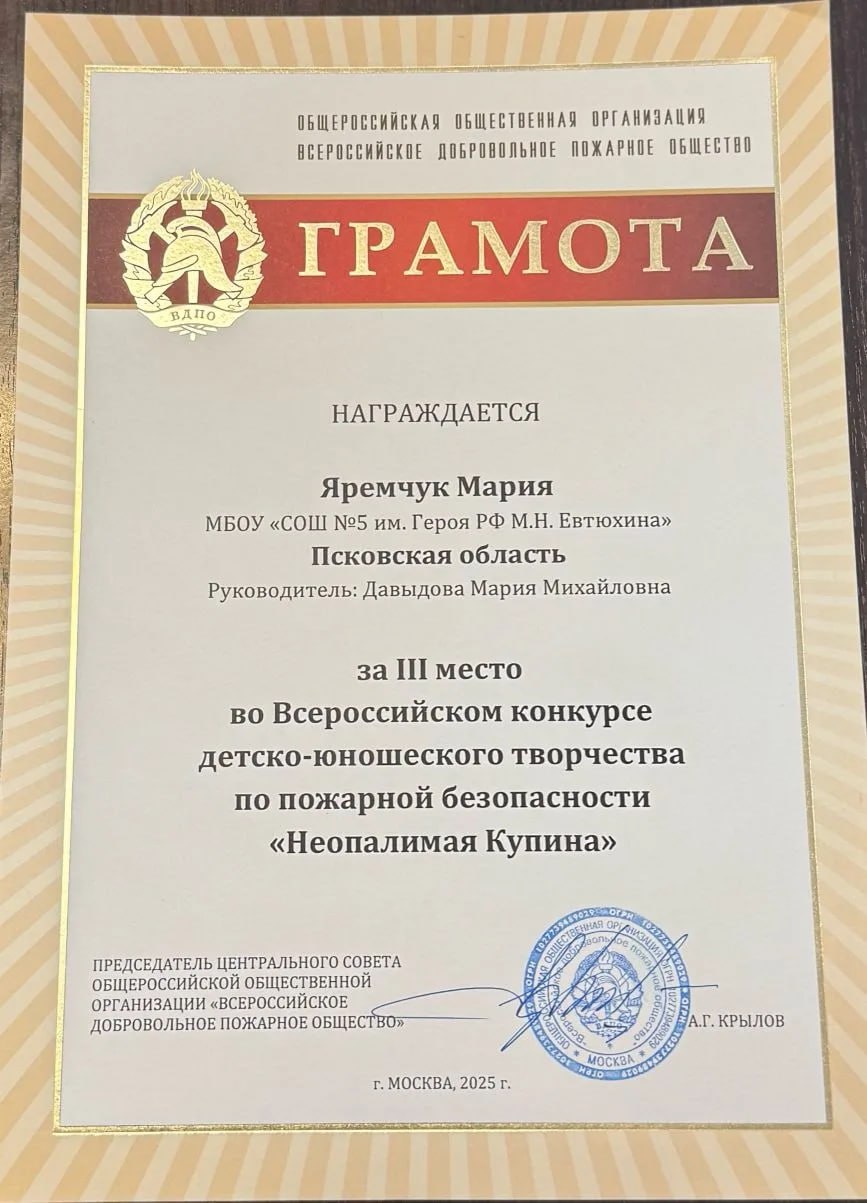 Достойный результат показала юная псковичка. Мария Яремчук, выпускница 11 класса школы № 5 имени Героя РФ М. Н. Евтюхина, заняла 3е место в номинации «Декоративноприкладное творчество».