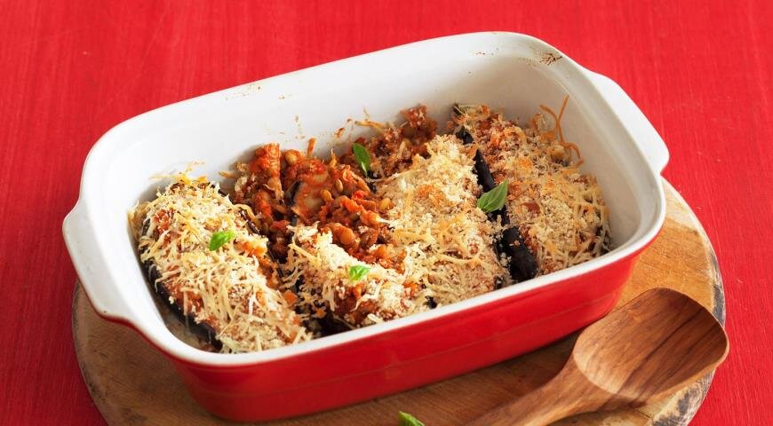 Баклажаны должны стать мягкими. Переложить их в форму для запекания и заполнить начинкой из чечевицы. Остатки можно разложить вокруг. Посыпать сверху пармезаном и крошками белого хлеба, а затем запекать 30–35 минут до золотистой корочки, пишет источник.