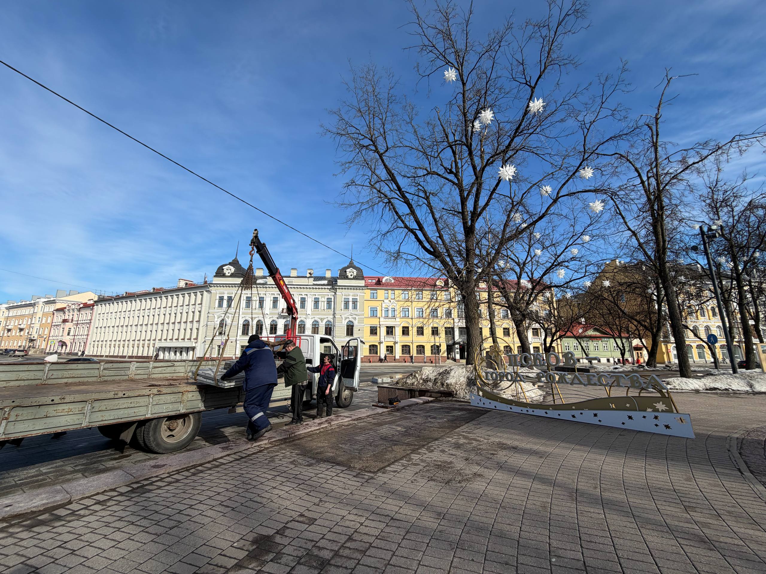Коммунальные службы приступили к демонтажу праздничного убранства. Поэтапно снимают гирлянды, разбирают световые инсталляции и готовят к хранению нашу ёлку.