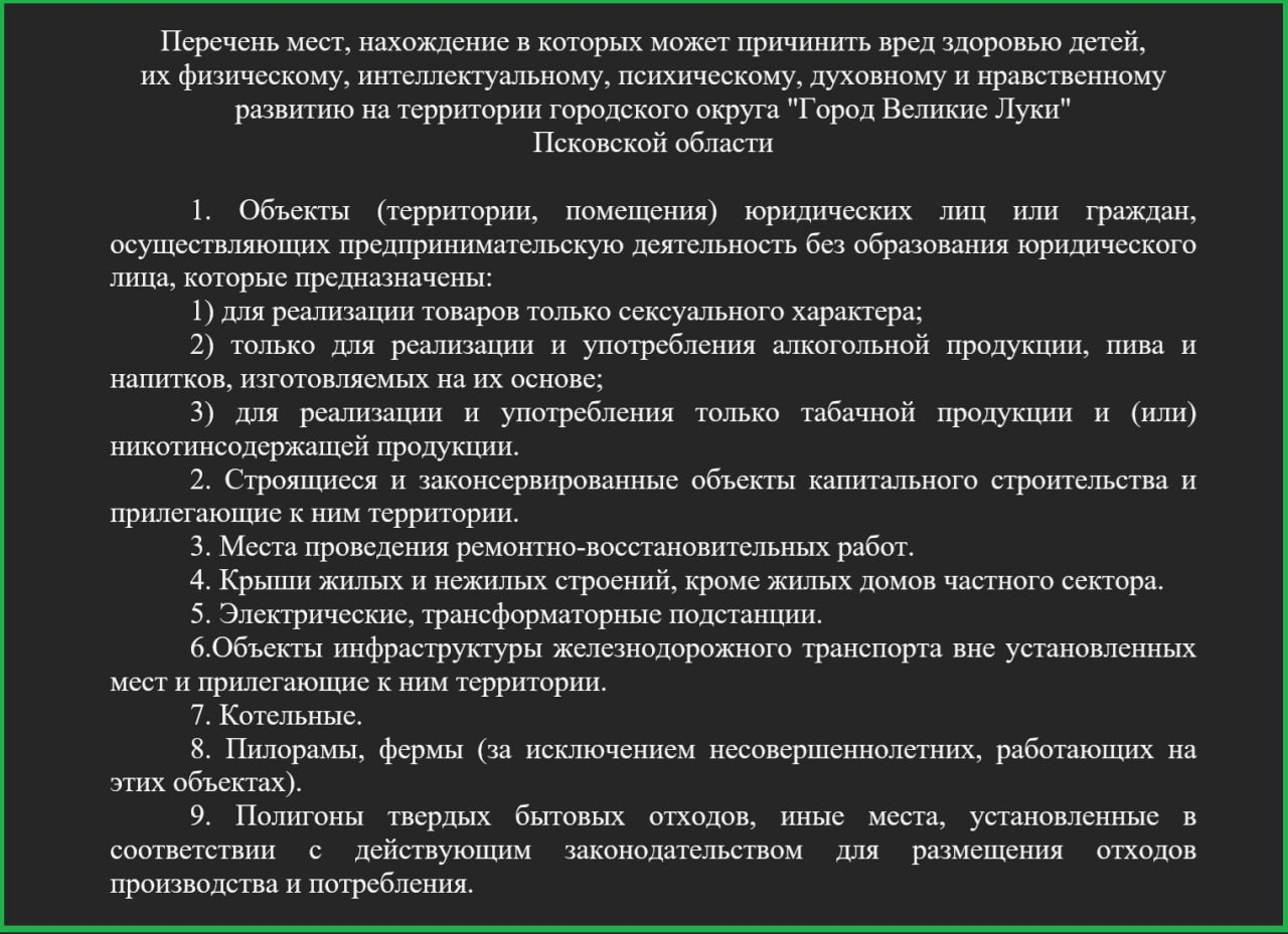 «В настоящее время администрация направила в экспертную комиссию перечень мест, нахождение в которых детей не допускается, для согласования и выдачи заключения. После согласования акт будет принят».