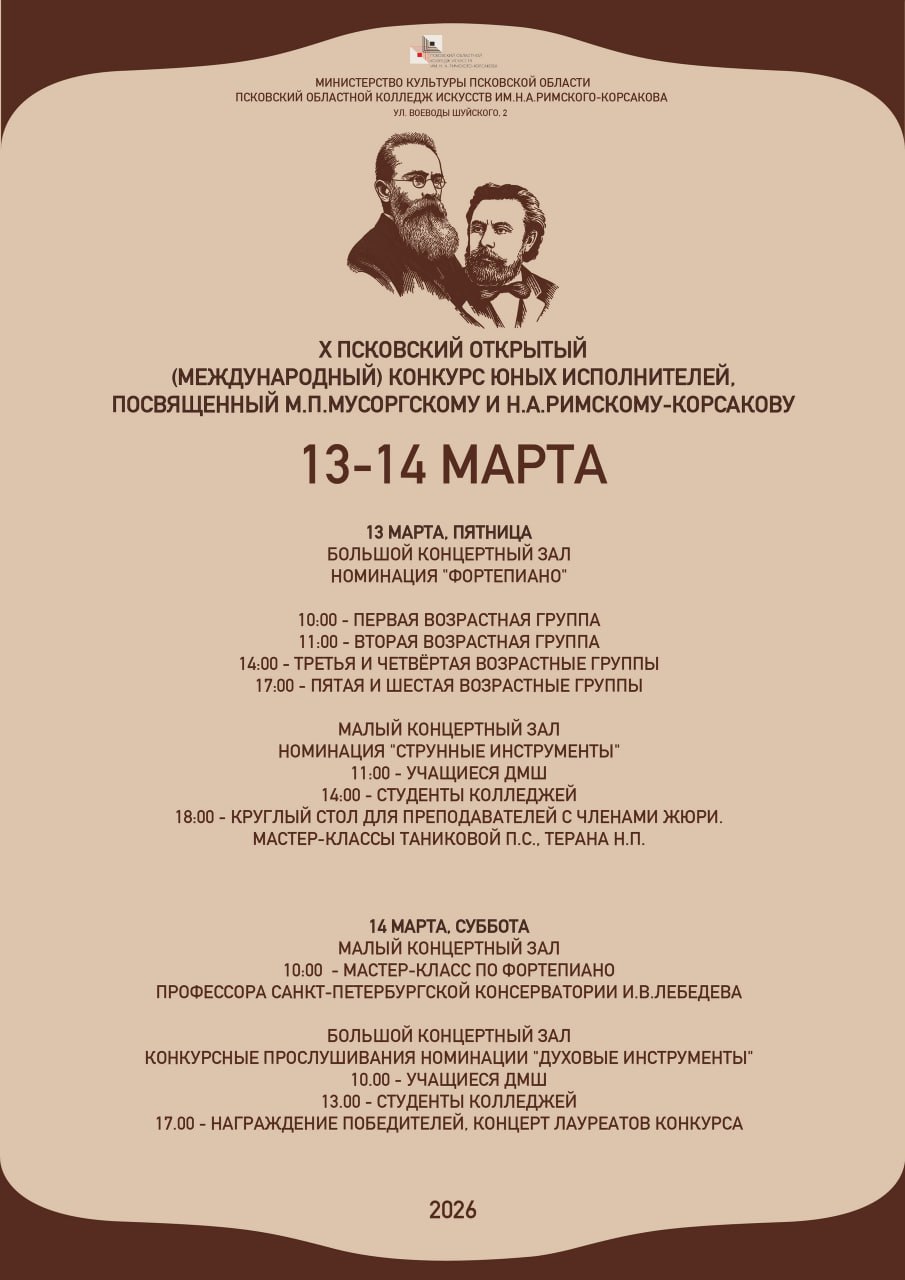 13–14 марта в Псковском областном колледже искусств пройдет X Международный конкурс, посвященный наследию М.П. Мусоргского и Н.А. Римского-Корсакова. В течение двух дней жюри будет оценивать мастерство юных пианистов, исполнителей на струнных и духовых инструментах.