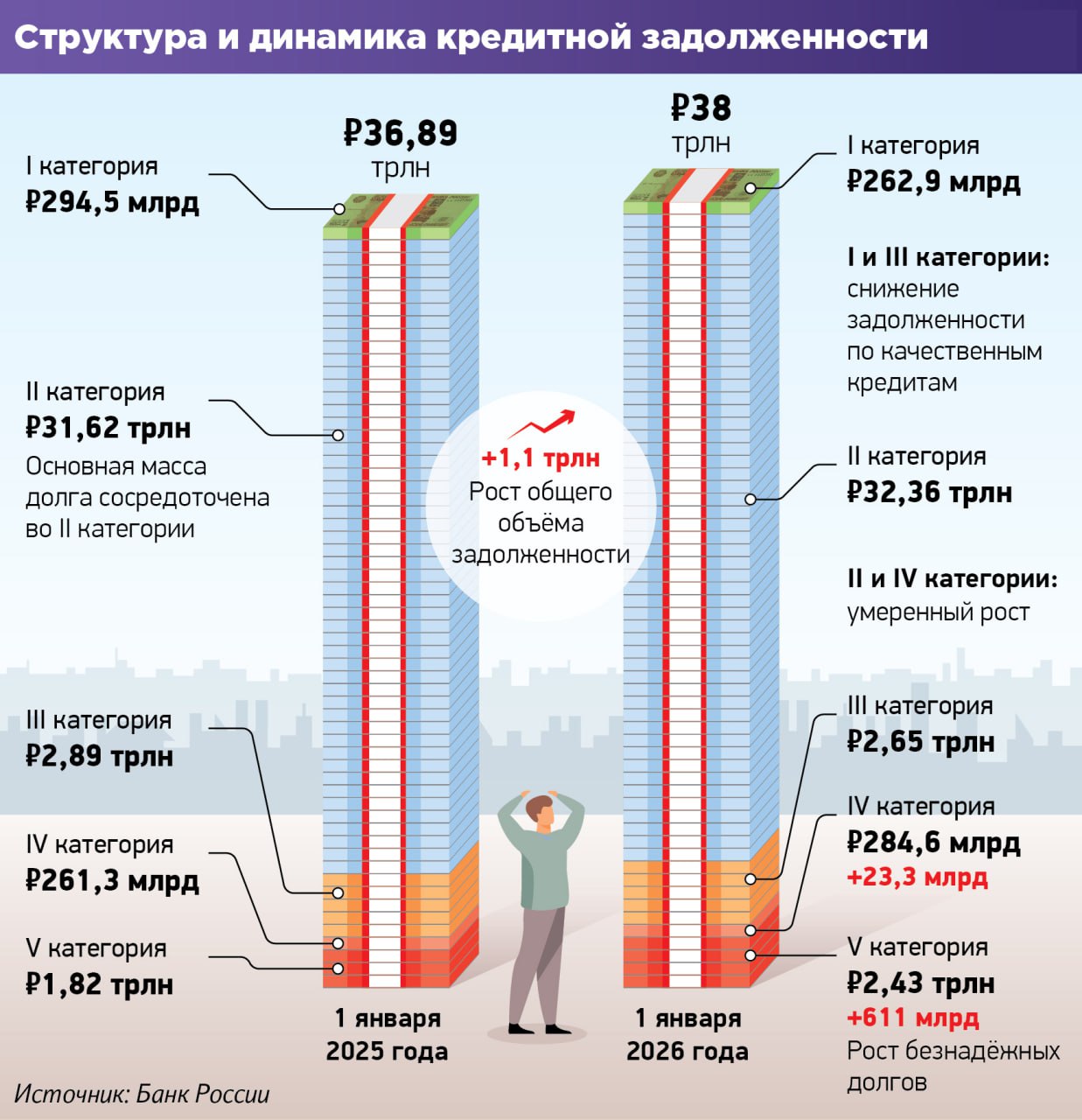 Задолженность россиян по кредитам самого низкого качества превысила 2,4 трлн по итогам прошлого года, следует из статистики Банка России. В 2024-м их было на треть меньше — около 1,8 трлн. Такие займы можно считать невозвратными, они относятся к пятой категории качества.
