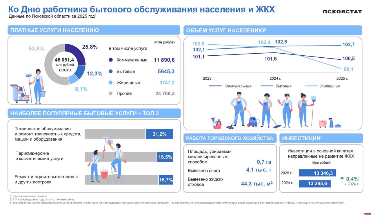 Псковстат представил предварительные данные о расходах жителей региона на жизненно важные услуги в 2025 году. На коммунальные услуги псковичи потратили 11,9 млрд рублей.