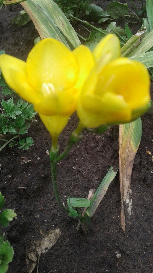 Однако после высадки в клумбу, дела у фрезий пошли не так. Цветы не пожелали расти — лишь две из них пережили это испытание и зацвели в июне. Их цветение было скромным: одно распустилось в желтом, а другое — в сиреневом.