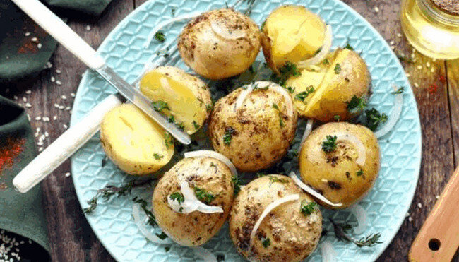 Картошку можно очистить от кожуры и нарезать на дольки, при этом посыпав свежей зеленью и луком для дополнительного вкуса.