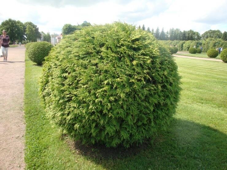 - Туя шаровидная: Имеет округлую крону и насыщенно-зеленую хвою. Достигает высоты до трёх метров и отличается морозостойкостью. Зимой зберегает яркий цвет, создавая эффектный контраст с белым снегом.