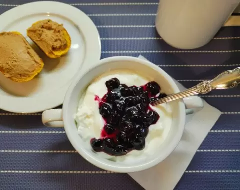 Завтрак: Порадуйте себя домашним йогуртом с сладким смородиновым вареньем и бутербродами с паштетом, дополненными ароматным кофе.