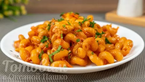 На следующем этапе в сковороду добавляется томатная паста, разведенная в воде, и все тщательно перемешивается. В конце выкладываются макароны и наливается молоко. Блюдо солится и перчится по вкусу, после чего накрывается крышкой. Готовить необходимо на небольшом огне, периодически помешивая, в течение 15 минут.