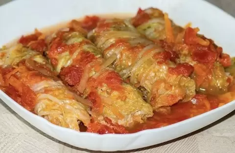 Голубцы помещаются в кастрюлю, заливаются соусом и тушатся на небольшом огне около 40-45 минут. Для запекания в духовке температура составляет 180 градусов.