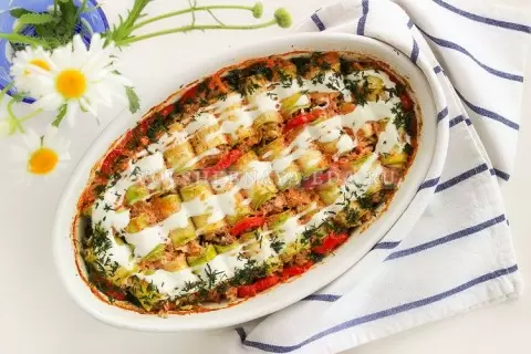 На широкий край каждого слайса выкладывают по одной чайной ложке начинки и аккуратно сворачивают в рулетик. Подготовленная форма смазывается растительным маслом, а рулетики укладываются в нее с добавлением кусочков сладкого перца для цветового контраста и аромата.