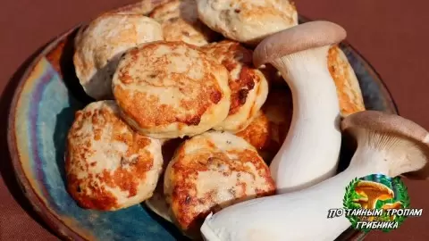 Для начала требуется подготовить грибную начинку. Лук нарезать мелко, грибы — кубиками. В разогретом растительном масле обжарить лук до золотистой корочки, добавить грибы и жарить, пока вся влага не испарится. Приправить солью и перцем, дать остыть.