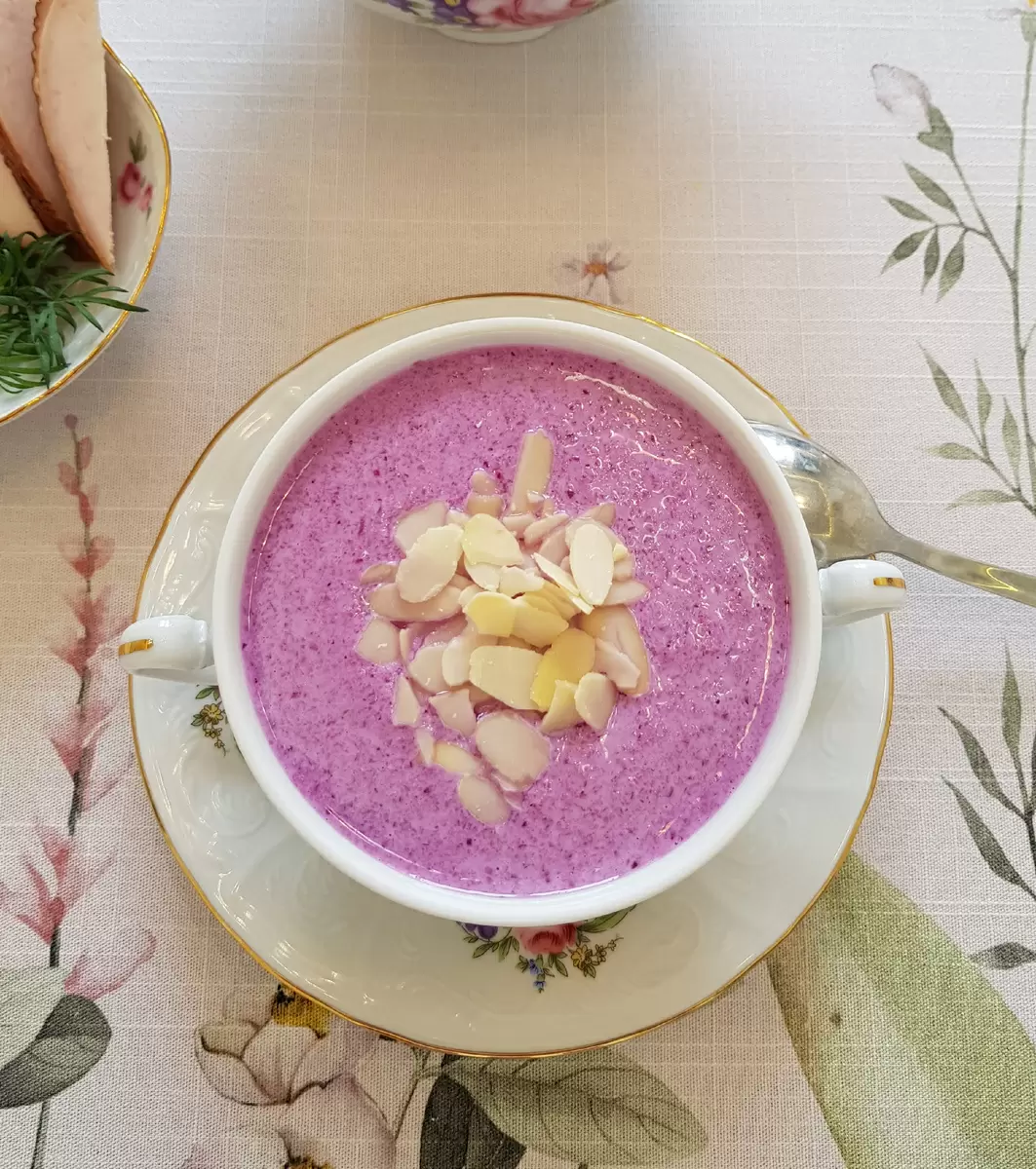 Готовый гаспачо следует разлить по красивым бульонницам и украсить миндальными лепестками. Это блюдо великолепно сочетается с гарниром из копченой утиной грудки и свежего укропа. Приятного аппетита!