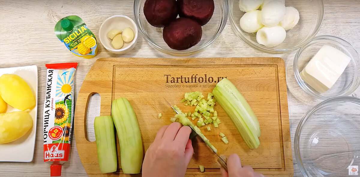 Для начала свеклу отварить и нарезать на мелкие кубики. Затем отварить картошку и яйца, тоже порезав их на кусочки. Теперь настало время подготовить огурцы: три свежих огурца мелко нарезать.