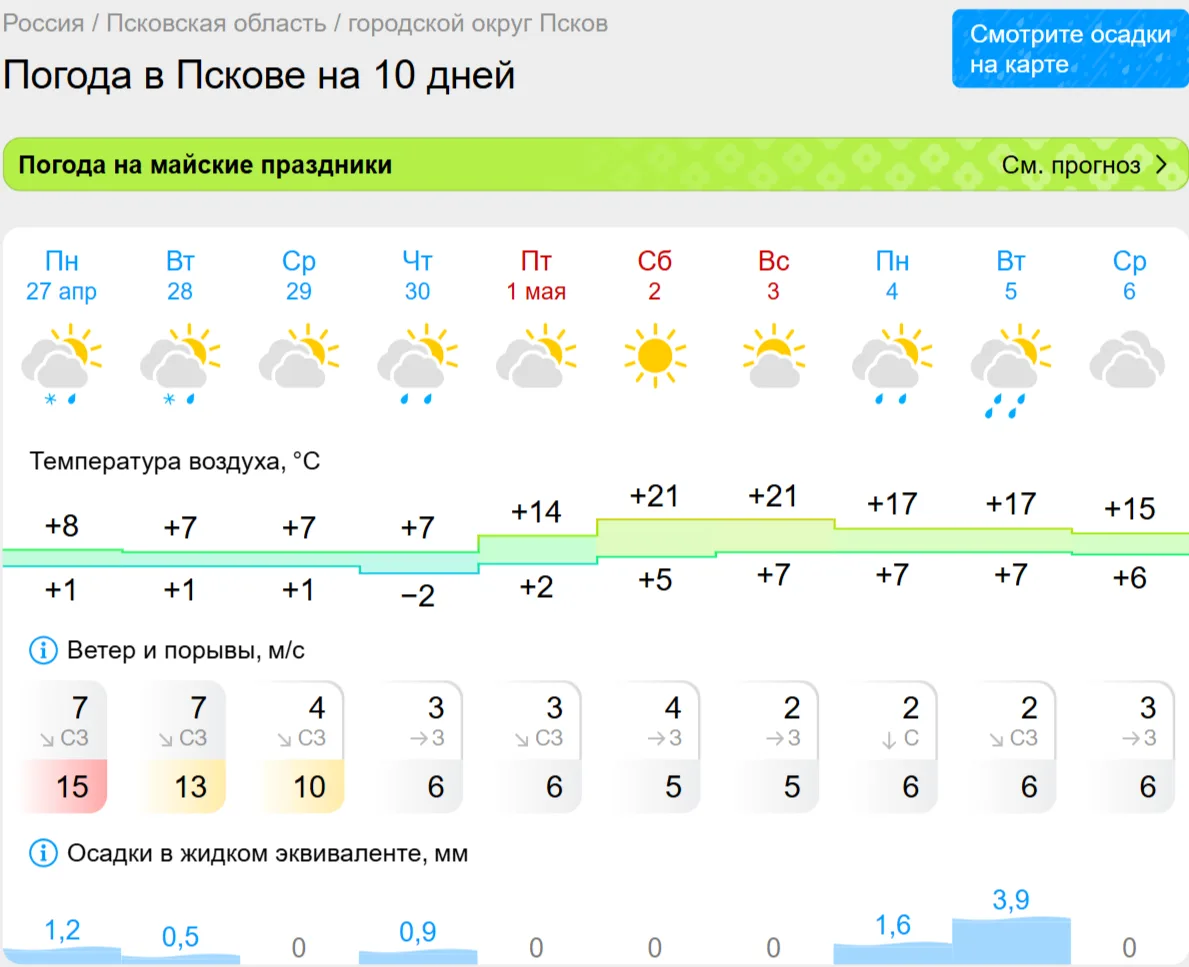 Днем местами небольшие осадки в виде дождя и мокрого снега, ночью без существенных осадков. Ветер северных направлений сильный, местами порывистый. Температура днем до +10 градусов, ночью -2…+3 градуса.В Пскове: без существенных осадков. Температура...