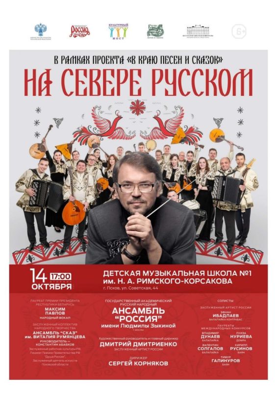 14 октября в детской музыкальной школе № 1 им. Н.А. Римского-Корсакова (Псков, ул. Советская, д. 44) состоится творческая встреча с Государственным академическим русским народным ансамблем «Россия» имени Л.Г. Зыкиной под руководством...